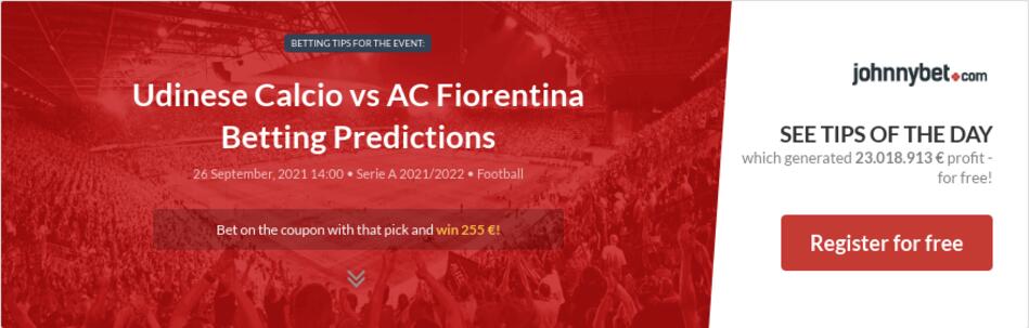 280221 Udinese vs Fiorentina 1. Udinese vs Fiorentina all Statistics to help you decide H2H Prediction Betting Tips all game Previews. They are going to play on the 26th September in Udine at Dacia Arena.